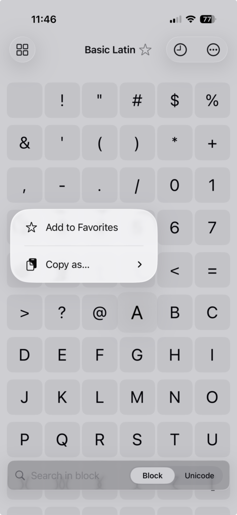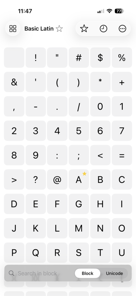 Um einen Zeichenblock (z. B. Basic Latin, Kyrillisch oder Georgisch) zu den Favoriten hinzuzufügen, tippe auf das Stern-Symbol neben dem Namen des aktuell angezeigten Blocks oberhalb des Rasters. Favoriten-Blöcke werden in der Rasteransicht mit einem gelben Stern markiert.