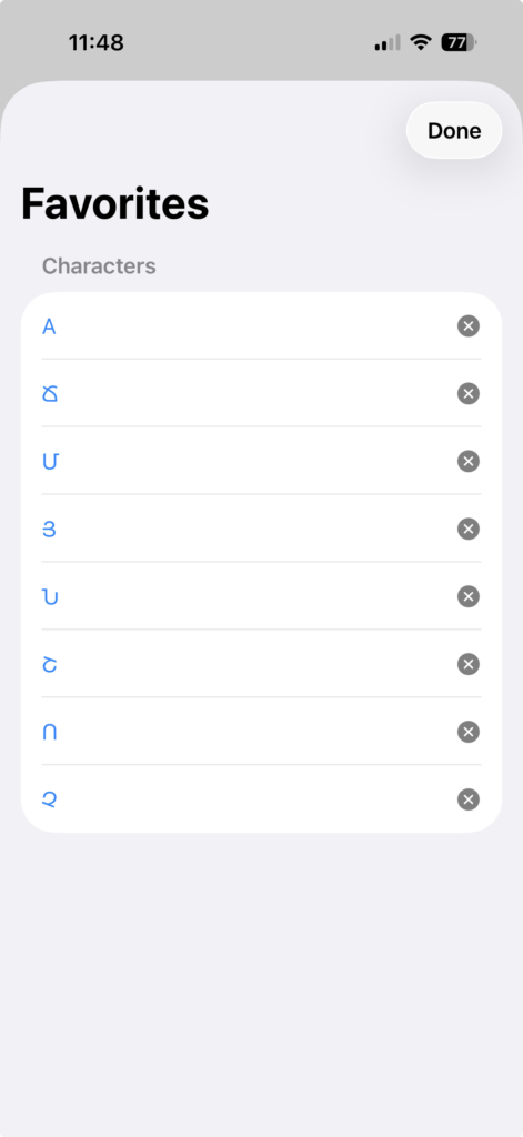 Du kannst ein Zeichen entfernen, indem du die Zuletzt-verwendet-Liste öffnest und das „ד neben dem betreffenden Eintrag antippst.