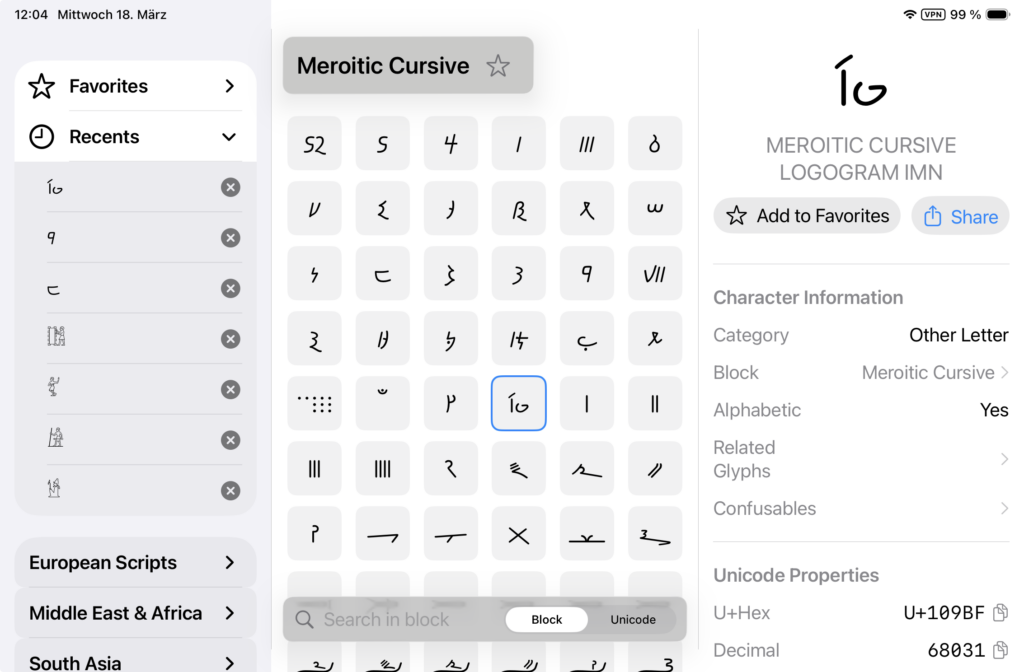 Tippe auf das Uhr-Symbol (auf iPad und Mac: Uhr-Symbol mit Bezeichnung „Recents“), um die Liste der zuletzt verwendeten Zeichen anzuzeigen. Wenn du ein Zeichen antippst, gelangst du zur Detailansicht, wobei der zugehörige Unicode-Block im Raster ausgewählt wird. Die gesamte Zuletzt-verwendet-Liste lässt sich in den Einstellungen löschen.