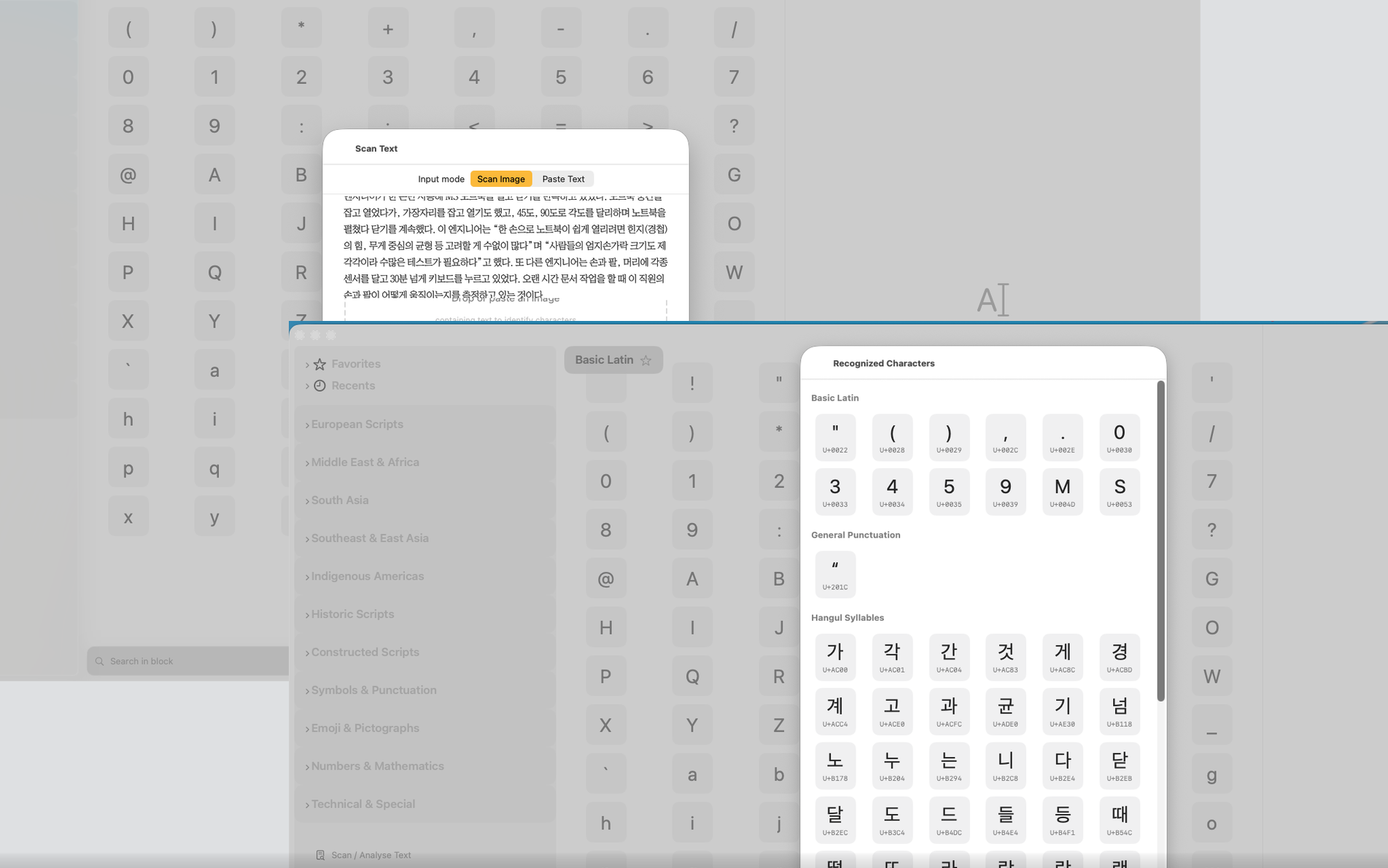 Wähle „Text scannen / analysieren“ (linke Spalte auf dem iPad bzw. im Menü auf dem iPhone), um die Kamera des iPhone oder iPad zu nutzen und einen Text zu scannen. Der Unicode Companion analysiert und identifiziert die enthaltenen Zeichen. Die erkannten Zeichen werden in einem Fenster angezeigt, gruppiert nach Schrift (z. B. Latein, Interpunktion, Hangul) und in Form eines Rasters mit der vollen Funktionalität der App (Zeichen kopieren, Details anzeigen usw.).